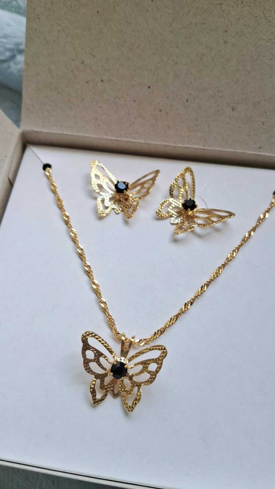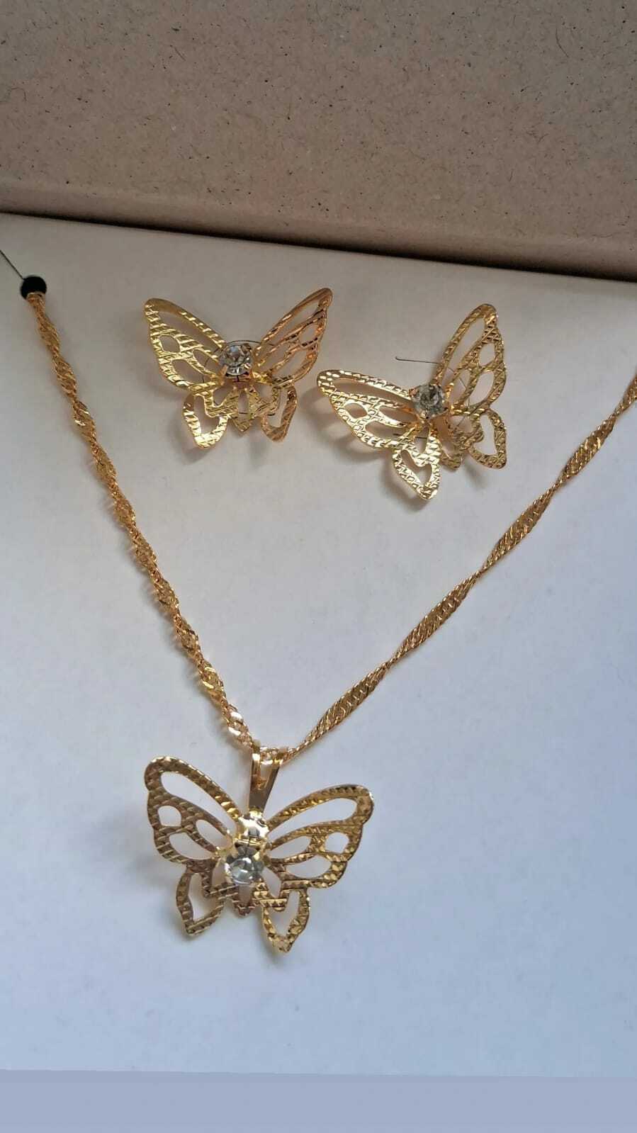 Apresentamos o Conjunto (brinco, pingente e corrente) de borboleta com uma pedrinha, uma peça incrível que vai dar aquele up no seu visual! 🌼
